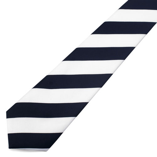 This adult black and white striped tie is made of a smooth satin polyester is a classic length and is a great accessory for sports club nights , fancy dress costume accessory or evening wear