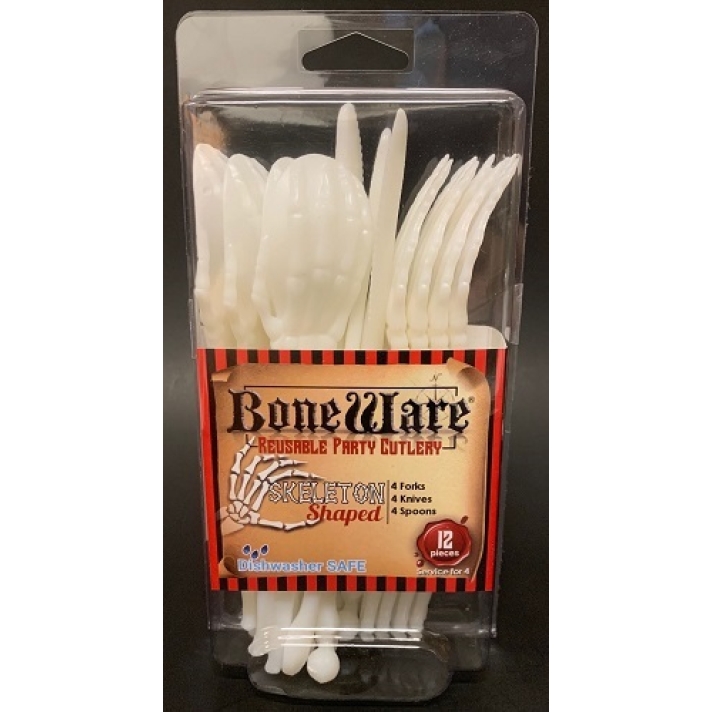 Each pack of BoneWare skeleton plastic cutlery contains a place setting for 4 people ie 12 pieces , 4 knives , 4 forks and 4 spoons