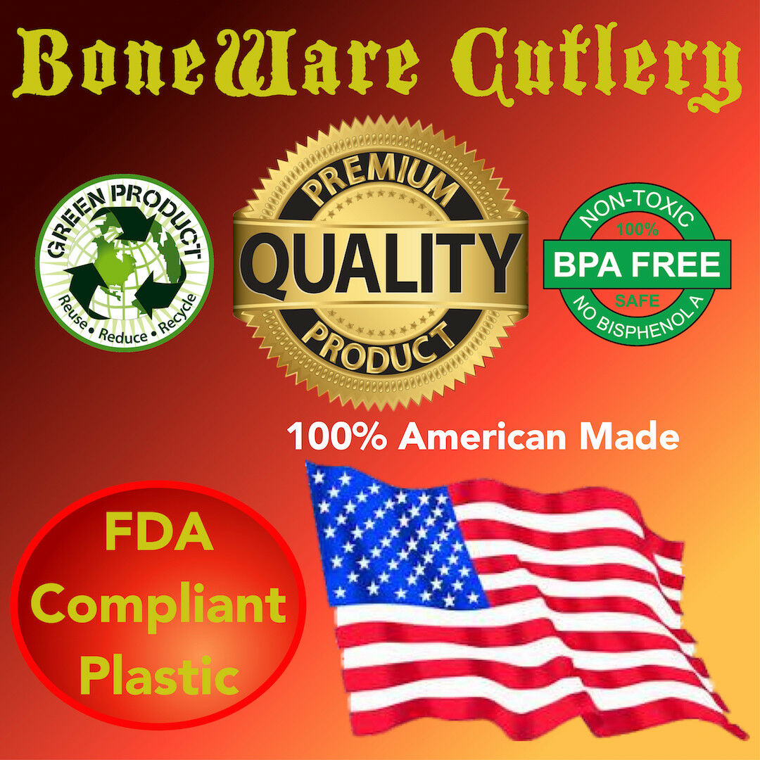 Each utencil of BoneWare skeletonreusable plastic party cutlery has been made with love and personally made and packed by the creator Ralph and his wife so attention and care are of an upmost priority
