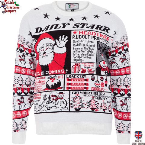 Daily Starr British Christmas Jumper is a full colour 2 sided designed long sleeved crew neck jumper in a multi newspaper style design print