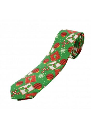 A bright green polyester Christmas themed tie with a festive Christmas design of candy canes , holly and Christmas tree baubles