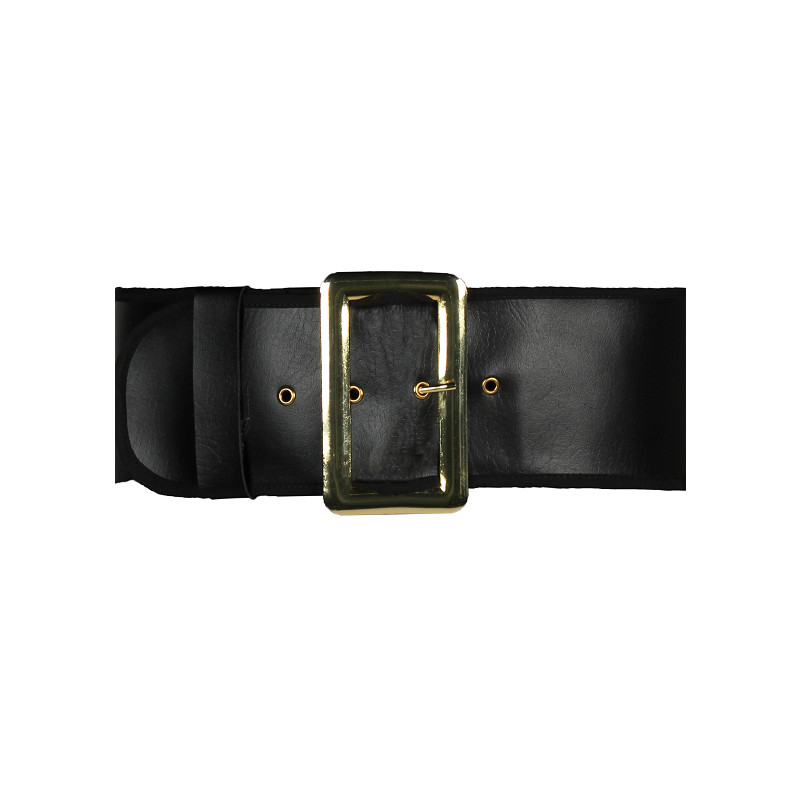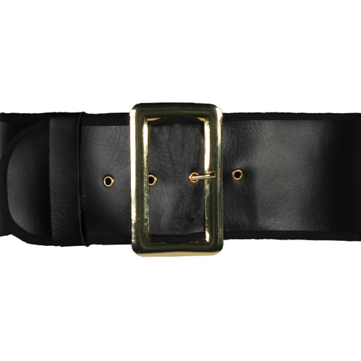 A gold coloured metal buckle mounted on a faux leather black belt measuring 9.4cm in width
