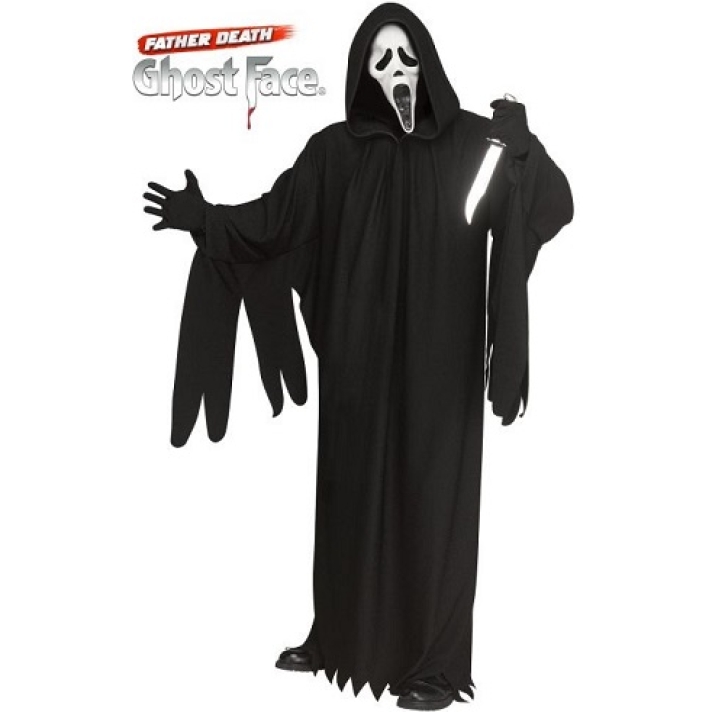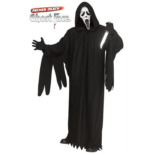 It includes a deluxe hooded robe with shimmering metallic accents, an official soft Ghost Face