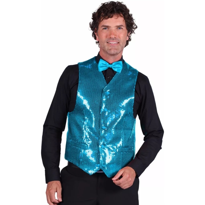 This turquoise blue sequin waistcoat is an easy to wear outfit and is ideal for parties either with a Christmas theme or an underwater theme as a merman , Eurovision theme or a great quiz master , gameshow host waistcoat