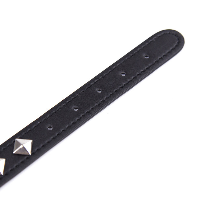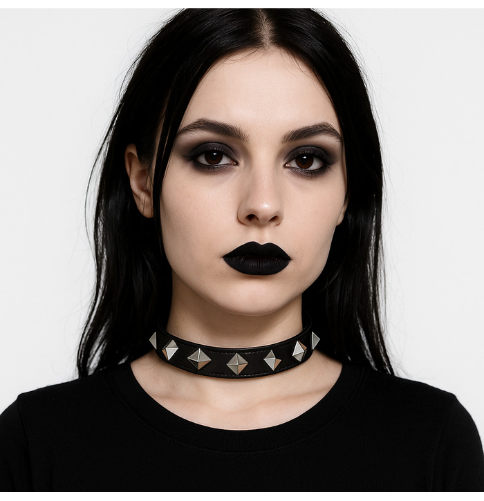 Crafted from high-quality PU-leather, this choker features a sleek design adorned with bold silver-tone pyramid studs, offering a perfect blend of punk-inspired flair and chic sophistication.