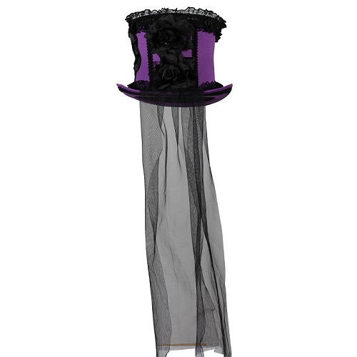 The same height as a traditional top hat however with a great black lace and beaded design with a black rear veiled train , these theatrical top hats come in 2 contrasting colours purple /black or red / black , and are the ideal headwear to finish off a number of costumes including burlesque themed dancers , showgirls or theatrical characters